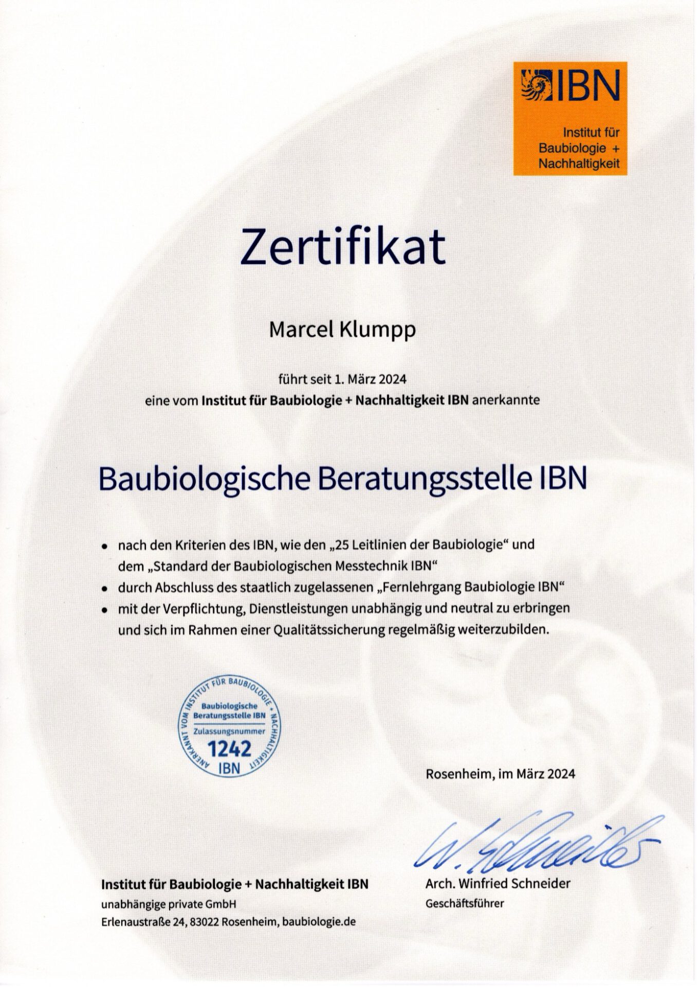 “Marcel Klumpp führt seit 1. März 2024 eine vom Institut für Baubiologie + Nachhaltigkeit IBN anerkannte Baubiologische Beratungsstelle IBN nach den Kriterien des IBN, wie den „25 Leitlinien der Baubiologie” und dem „Standard der Baubiologischen Messtechnik IBN […] mit der Verpflichtung, Dienstleistungen unabhängig und neutral zu erbringen und sich im Rahmen einer Qualitätssicherung regelmäßig weiterzubilden.