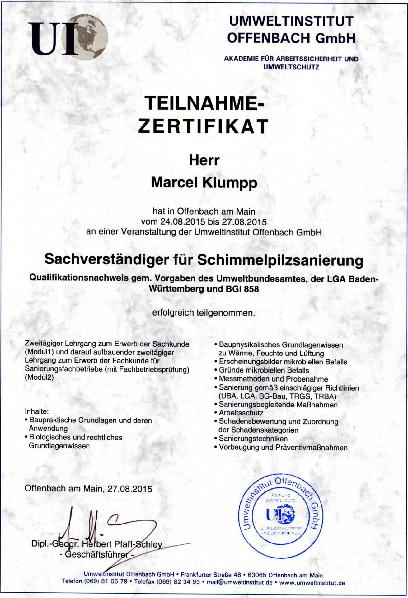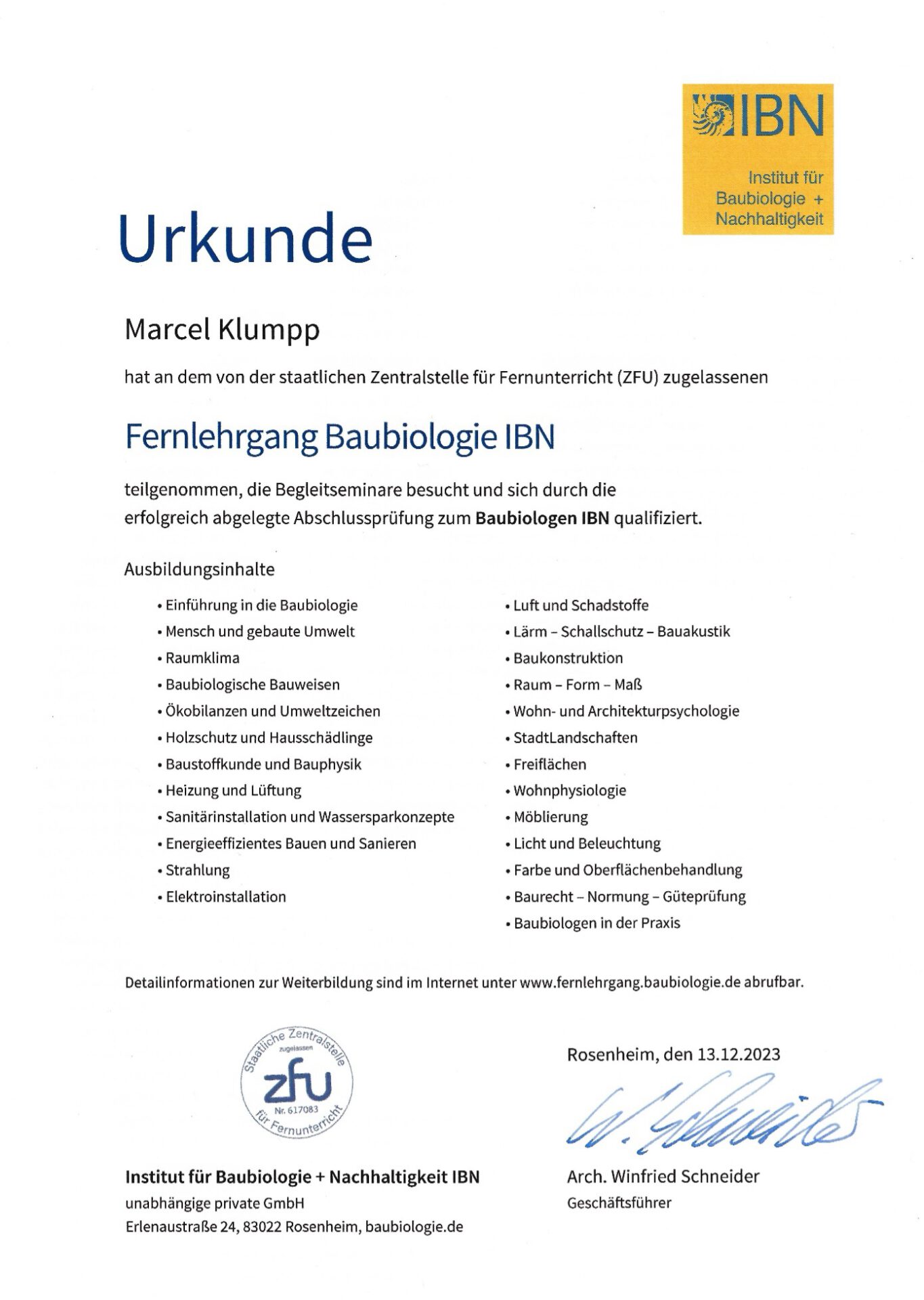 “Marcel Klumpp hat an dem von der staatlichen Zentralstelle für Fernunterricht (ZFU) zugelassenen Fernlehrgang Baubiologie IBN teilgenommen, die Begleitseminare besucht und sich durch die erfolgreich abgelegte Abschlussprüfung zum Baubiologen IBN qualifiziert.” (Dauer des Fernlehrgangs: 2 Jahre; Bestanden mit der Note 1)