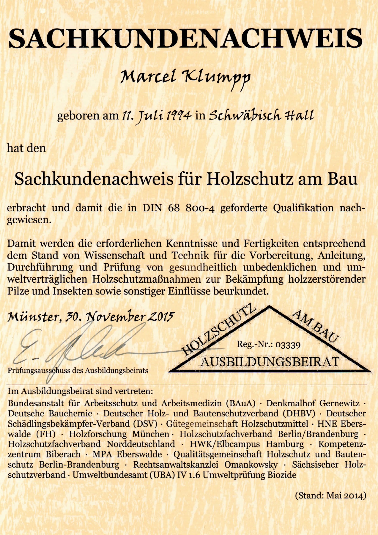 “[…] Kentnisse und Fertigkeiten […] für die Vorbereitung, Anleitung, Durchführung und Prüfung von gesundheitlich unbdenklichen und umweltverträglichen Holzschutzmaßnahmen zur Bekämpfung holzzerstörender Pilze und Insekten sowie sonstiger Einflüsse beurkundet.”